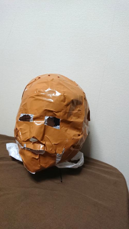 まずはサイズを私の顔に合わせるためにガムテープとビニール袋で自分の顔をかたどりました。